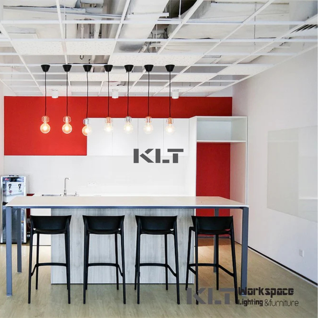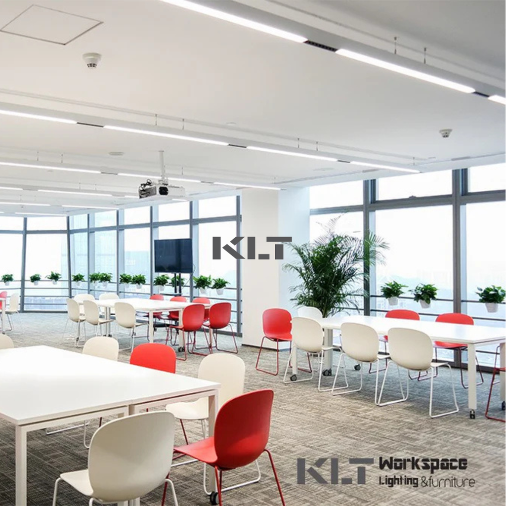 A modern and efficient workspace designed to support collaboration, comfort, and flexible usage. The rectangular long worktable with integrated cable management ensures a tidy and organized workstation, ideal for team collaboration and daily office tasks. Ergonomic chairs provide essential support for long working hours, enhancing productivity and well-being. The high table paired with bar stools creates an informal discussion or quick-meeting area, while plastic stacking chairs offer lightweight, versatile seating suitable for training, events, or additional visitor needs. The overall setup blends practicality with modern aesthetics, making it suitable for a dynamic commercial office environment.
