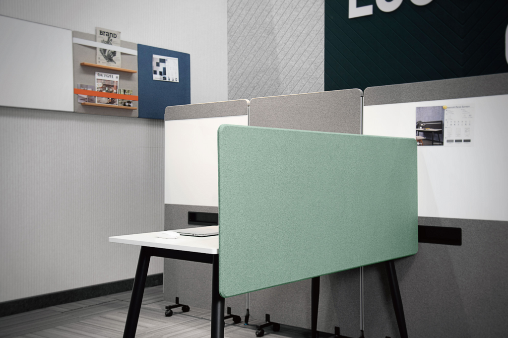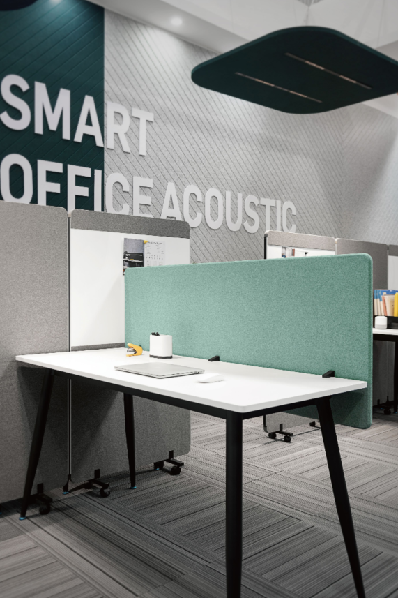 EFP-31桌上屏風以PET為基材,表面包覆聚酯纖維面料,並採用倒邊工藝處理,提供9+9mm或12+12mm雙層加厚結構。R30mm圓角安全設計,多種寬度規格可靈活配置,兼具吸音效果與精緻細節美感。