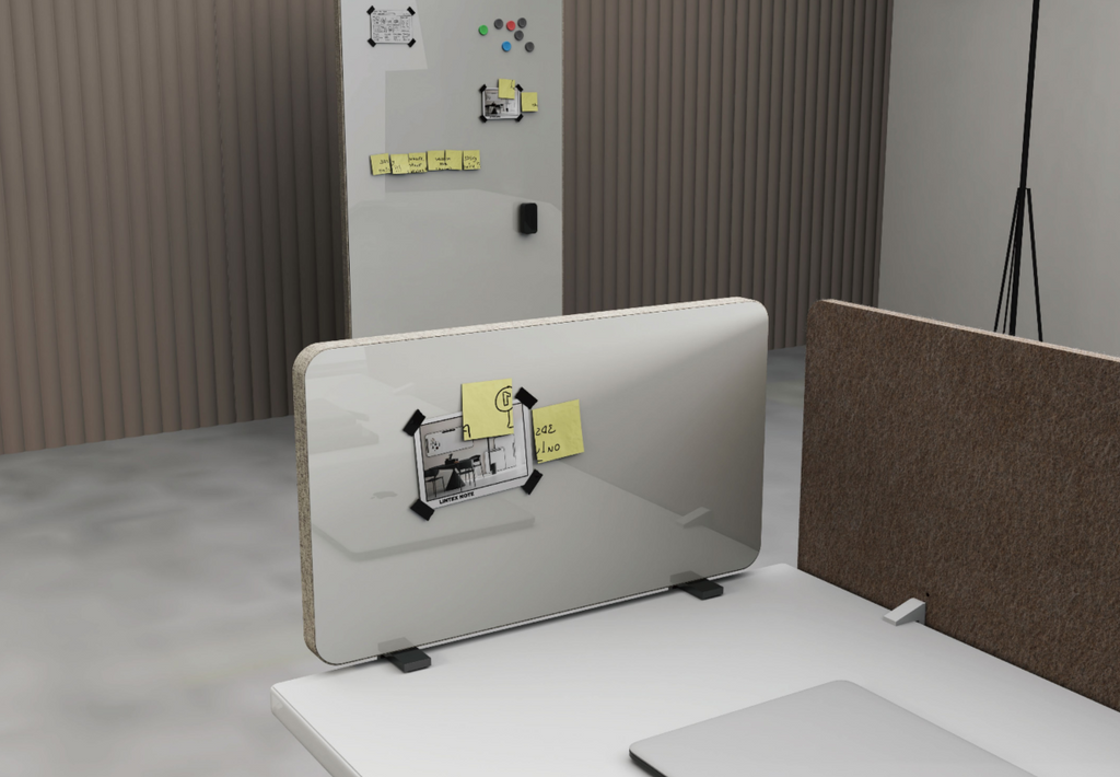 EFP-41桌面白板以PET板為芯材,一面布料包覆,另一面為超白鋼化玻璃白板,40mm厚度提供優異吸聲效果與穩固結構。R40mm圓角安全設計,600×340mm精巧尺寸適合置於辦公桌使用,兼具書寫功能與空間靜音需求。