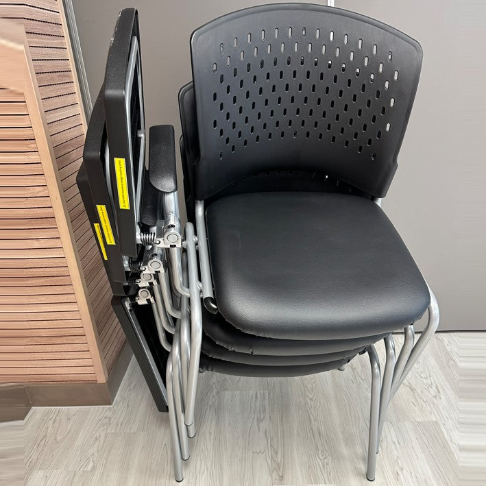 G8912S培訓椅採用黑色膠背殼搭配實用手寫板,座位提供F8布料與黑色仿皮雙重選擇。可疊高設計便於收納管理,台灣製造確保優良品質。整合式設計完美結合座椅與書寫功能,專為各類培訓場所與教育空間打造。
