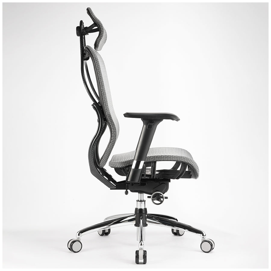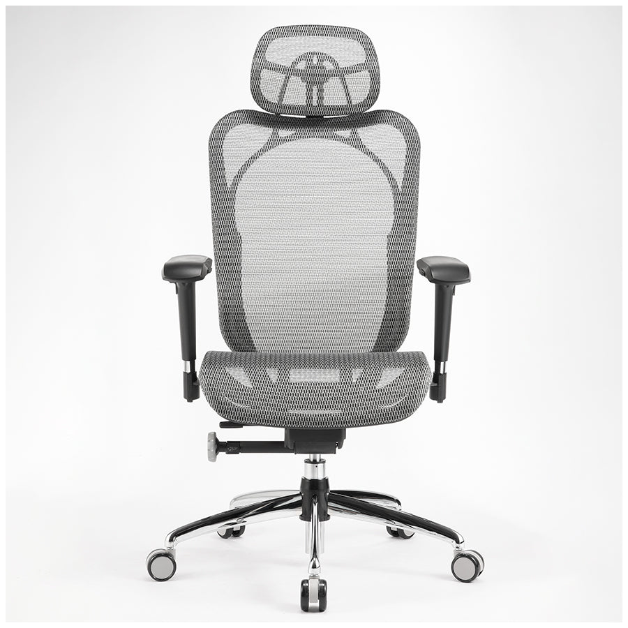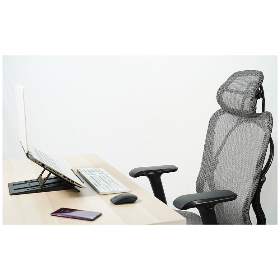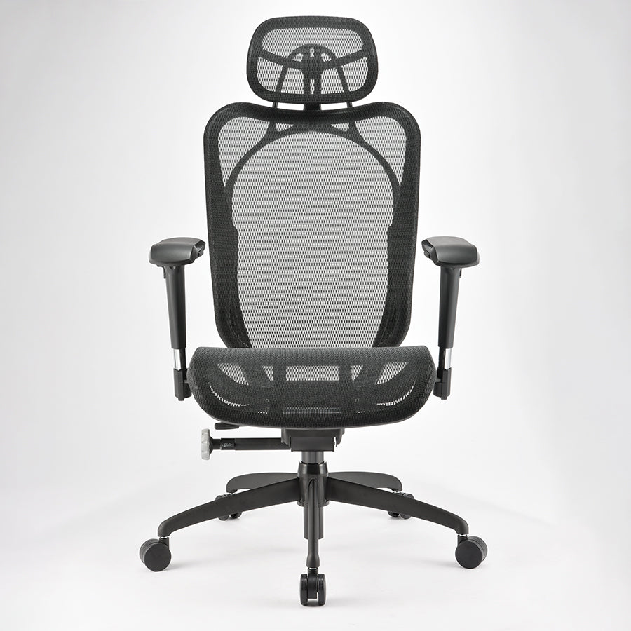 T05 PLUS 高背辦公椅全面採用美國Matrex高彈力網布,無泡棉設計確保極致透氣性。10cm可調頭枕完整支撐頭頸部,4D大面積扶手支援多向鎖定調節。單邊操控托盤簡化操作流程,一體成型框架通過BIFMA認證,台灣製造三級氣壓棒與金屬五星腳架提供穩固支撐。