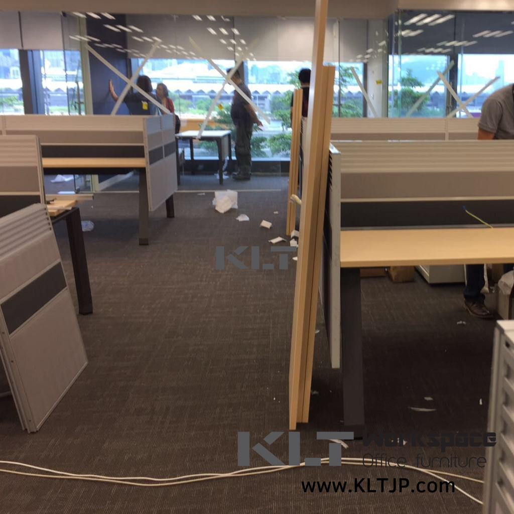 A modern and efficient office setup tailored for security service operations. The design features office desks equipped with half-glass high partitions to balance openness and privacy, creating a bright yet focused workspace. Complemented by mobile pedestals with rotary handles, the layout enhances organization and flexibility, ensuring a clean, professional, and functional environment suitable for administrative and daily operations.