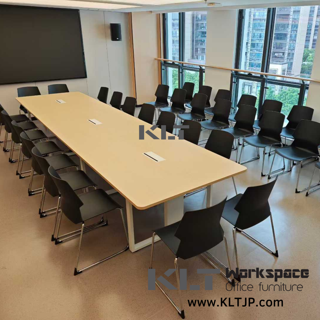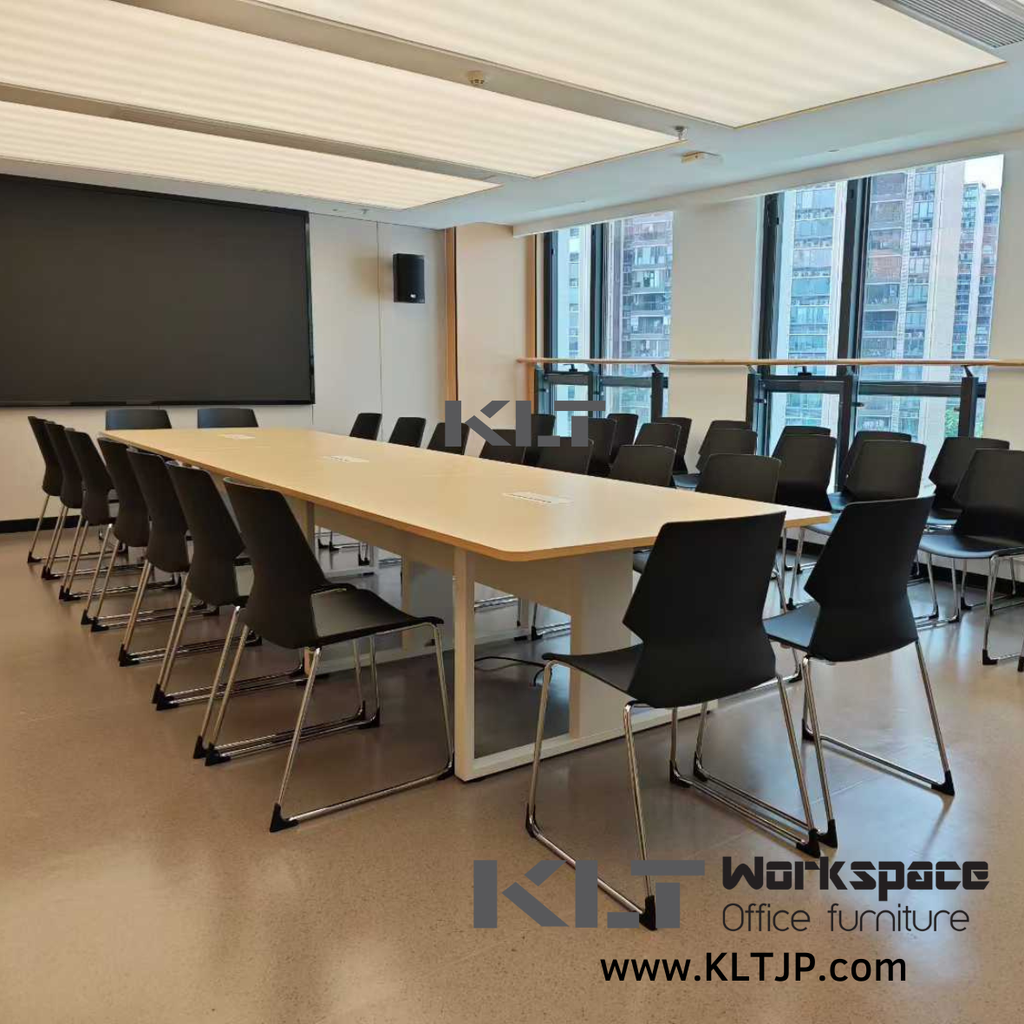 整體設計專業簡約,適合企業辦公與會議使用。會議桌配備電線管理系統,保持桌面整潔有序;長方形會議桌方便團隊討論與會議交流;塑料疊椅輕巧耐用,靈活應用於不同場合。整體風格融合現代感與實用性,營造高效舒適的商務環境。