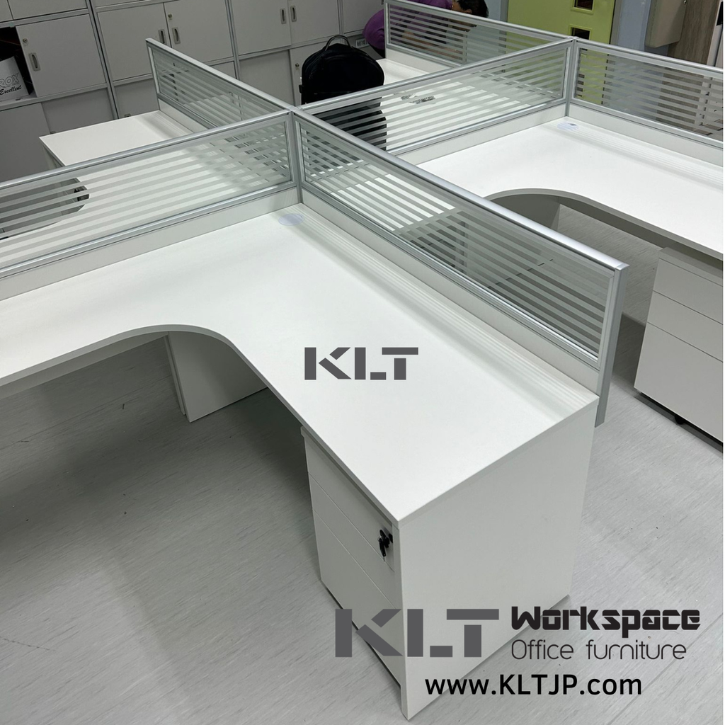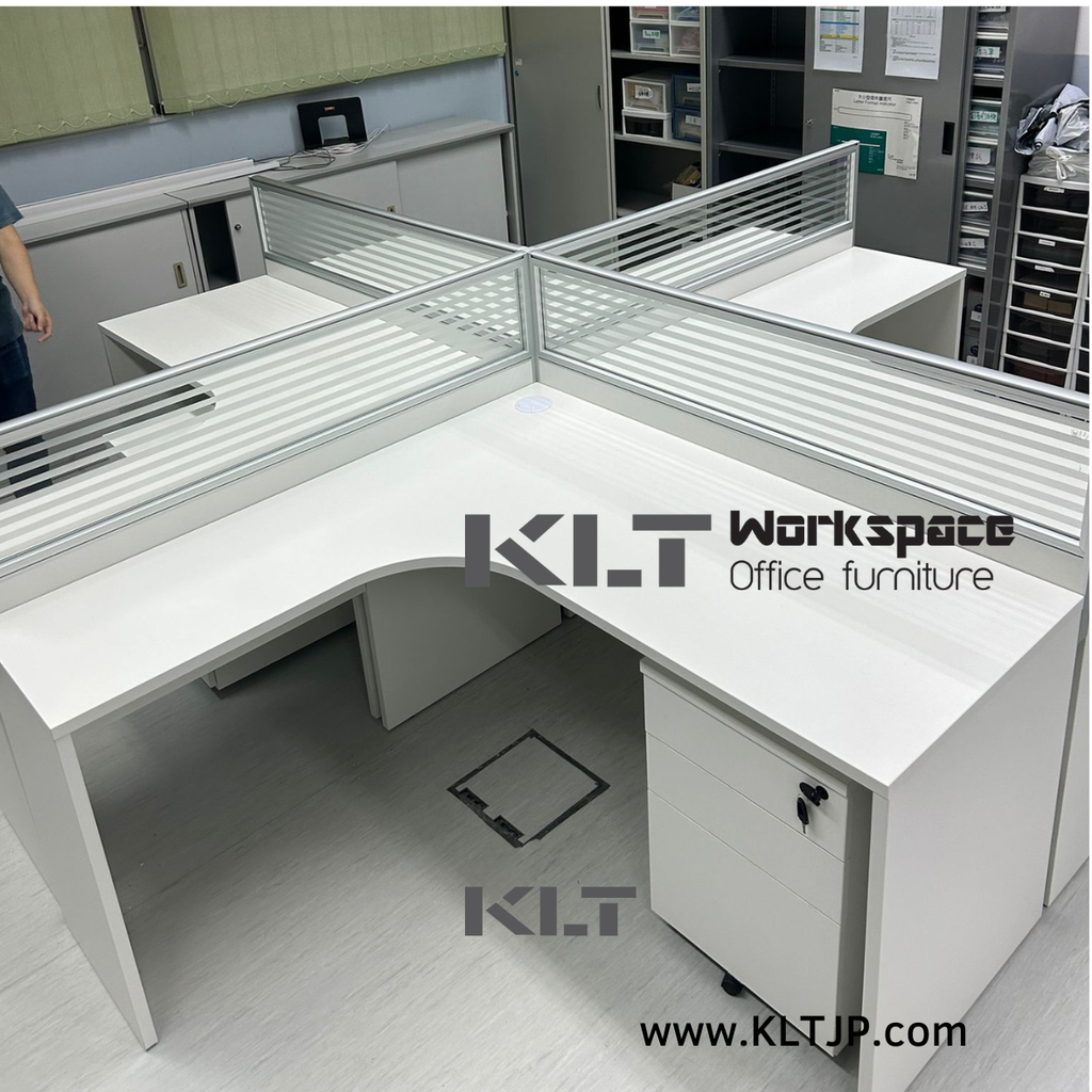 Products: L-Shaped Staff Desk, Glass Partition, Mobile Three-Bin Cabinet, Double Door Rolling Steel Cabinet
