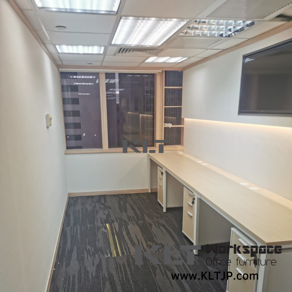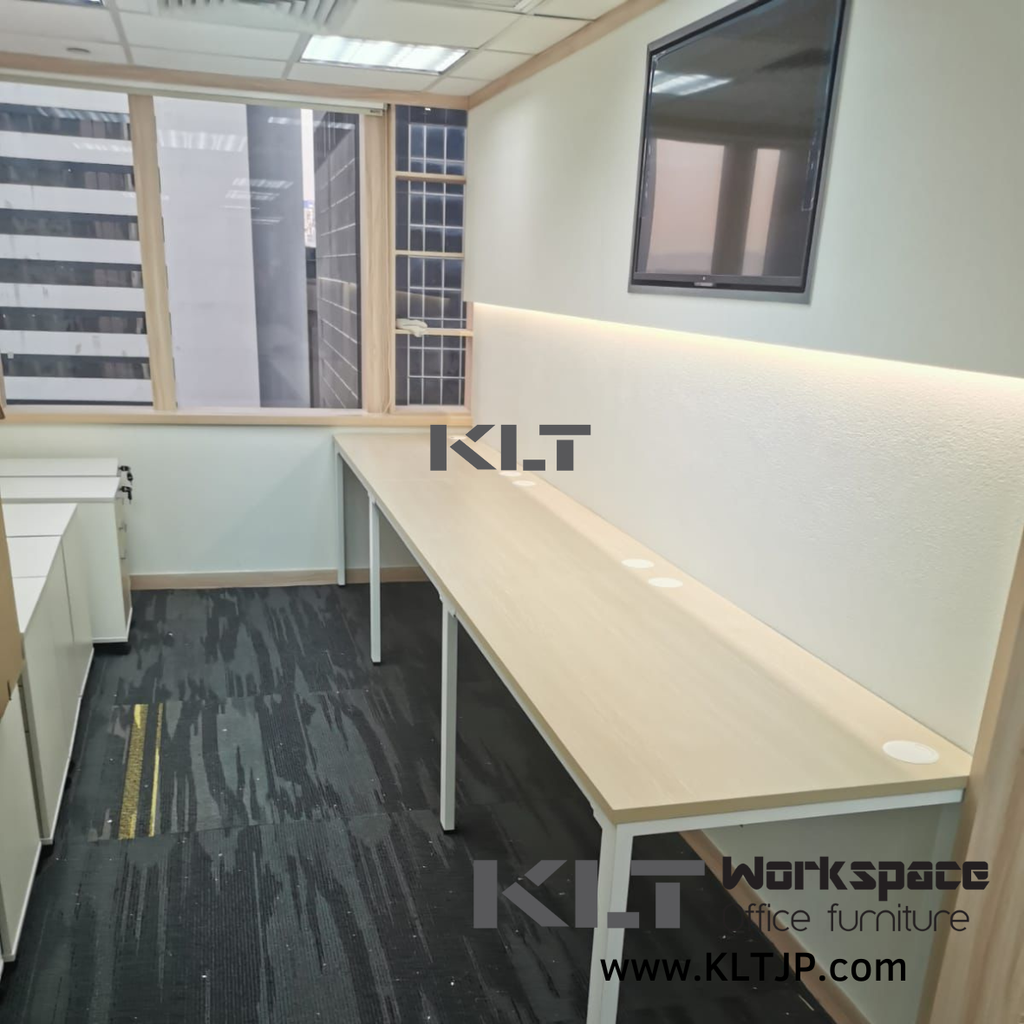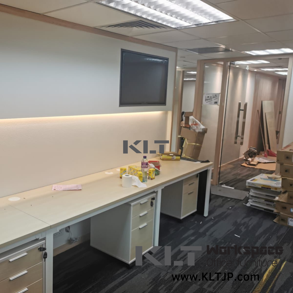 整體設計高雅實用,為金融機構打造兼具專業與舒適的辦公環境。長型職員台促進團隊協作與空間規劃;可移動三桶櫃靈活收納,提升工作效率;高身木製廚櫃與吊櫃提供完善儲物功能,並以木質紋理增添溫暖氛圍。整體風格簡潔現代,體現大新金融中心專業穩重的企業形象。