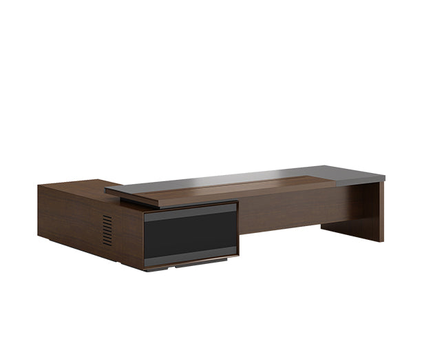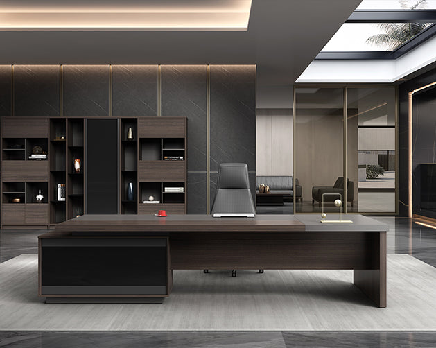 木質行政大班桌連儲物側櫃以簡潔而富有張力的線條搭配深棕色調檯面,後櫃採用玻璃隔板設計展現靈活通透感,搭配源自意大利的3A級皮革行政椅,觸感柔軟細膩。透過材質與設計的精心搭配,為少數精英人士打造獨特選擇,完美詮釋果斷睿智商業人士的卓越品味。整體設計既彰顯專業氣場,又兼具藝術美感,成為高階行政空間的點睛之筆。