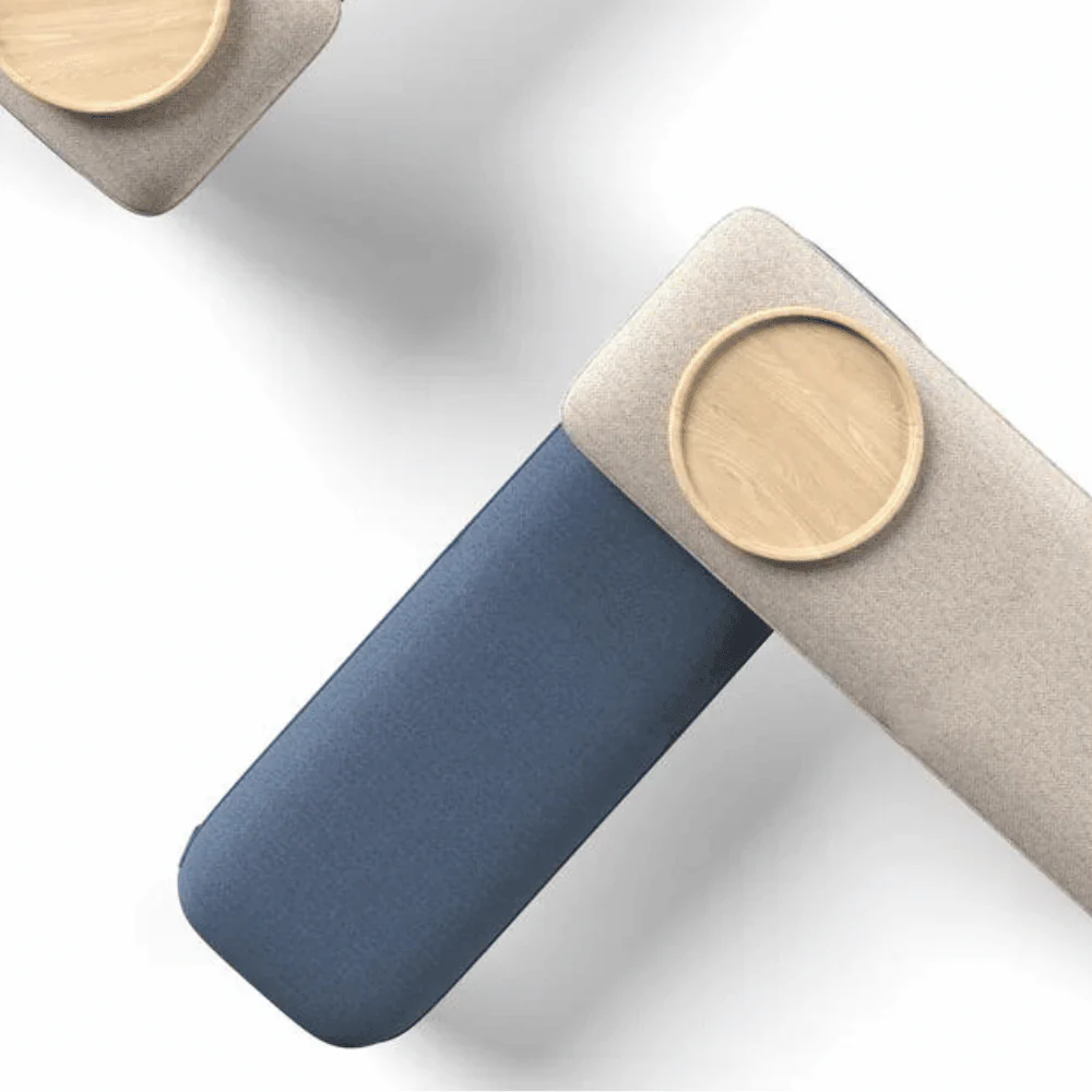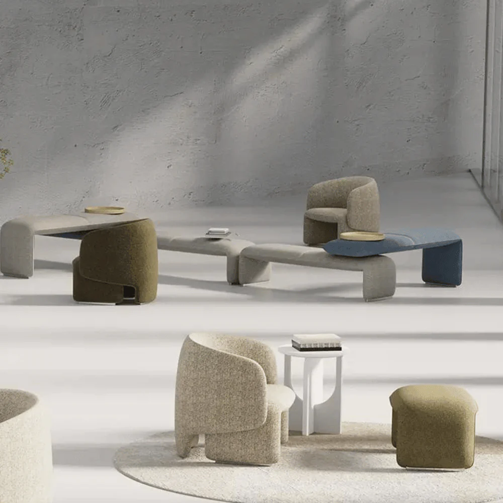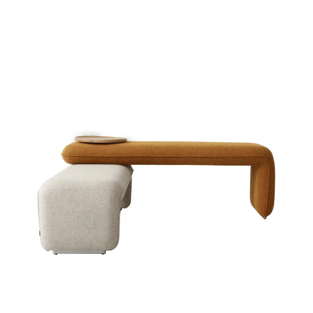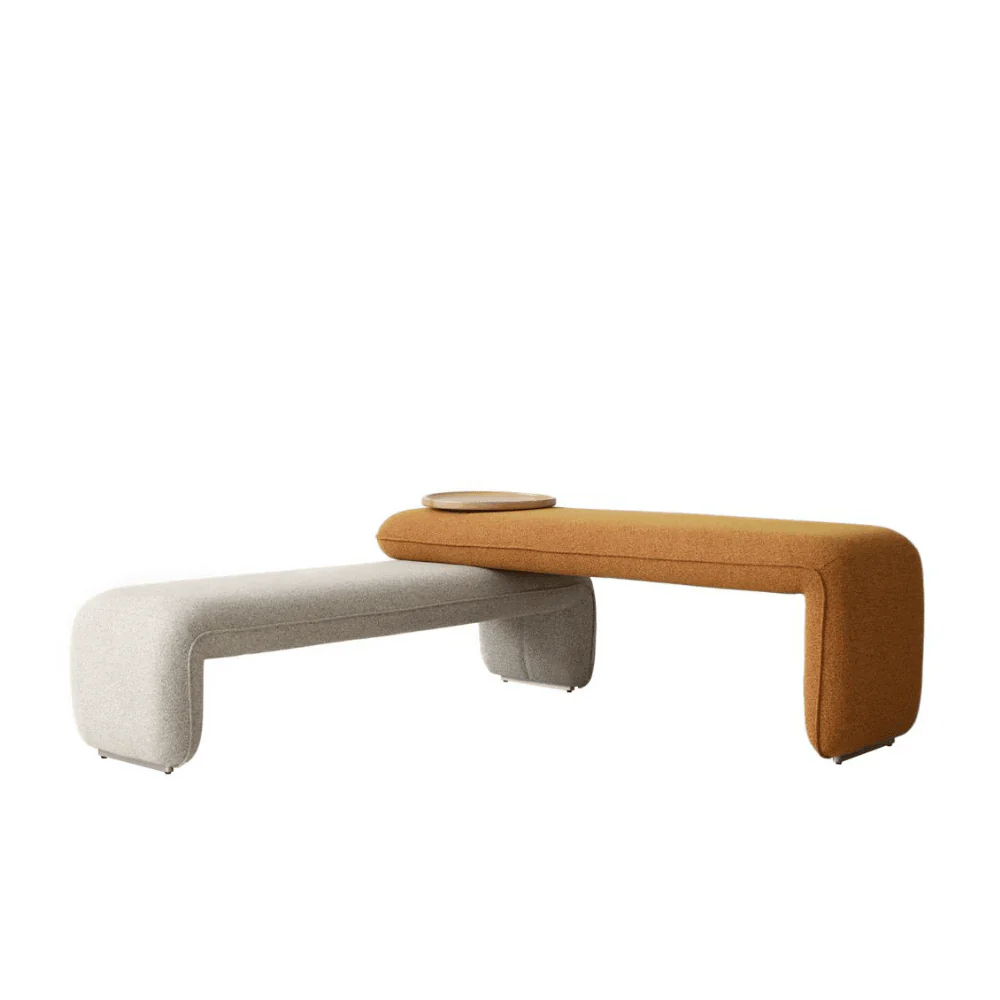 Sectional長凳以大象穩固形態為設計靈感,將厚實背部與巨大耳朵特徵轉化為包覆式椅背與圓潤扶手。一體式折疊座墊搭配略微彎曲弧度,提供全面舒適支撐。鋼製方形管材底座確保穩定性,採用進口布料或PU皮革包覆,內部使用環保材質與無苯膠水粘合,展現簡潔流暢的設計美學。
