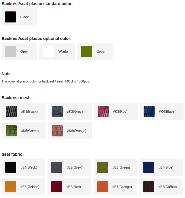 背框: 尼龍加纖,(可調)高度,帶尼龍(固定)腰靠,帶ABS(透明)裝飾件,布料為杜邦尼龍網布。