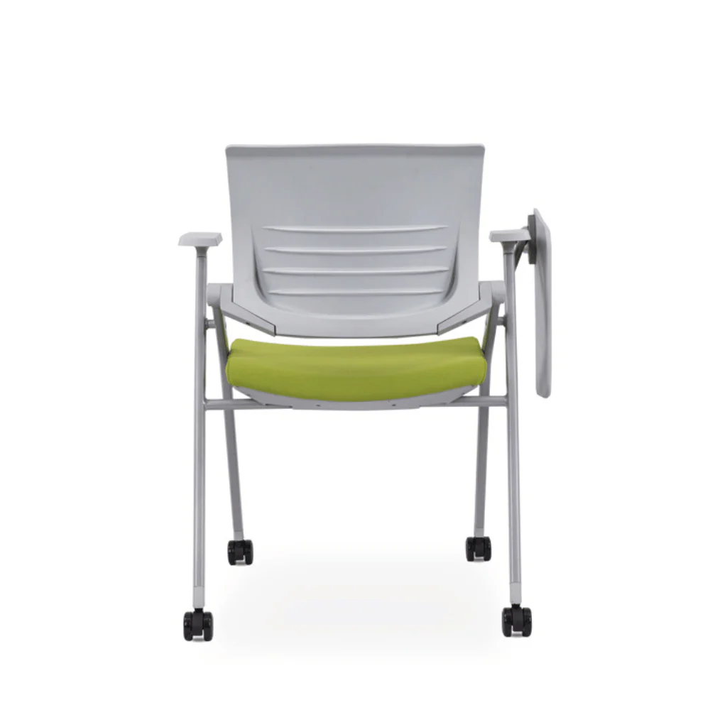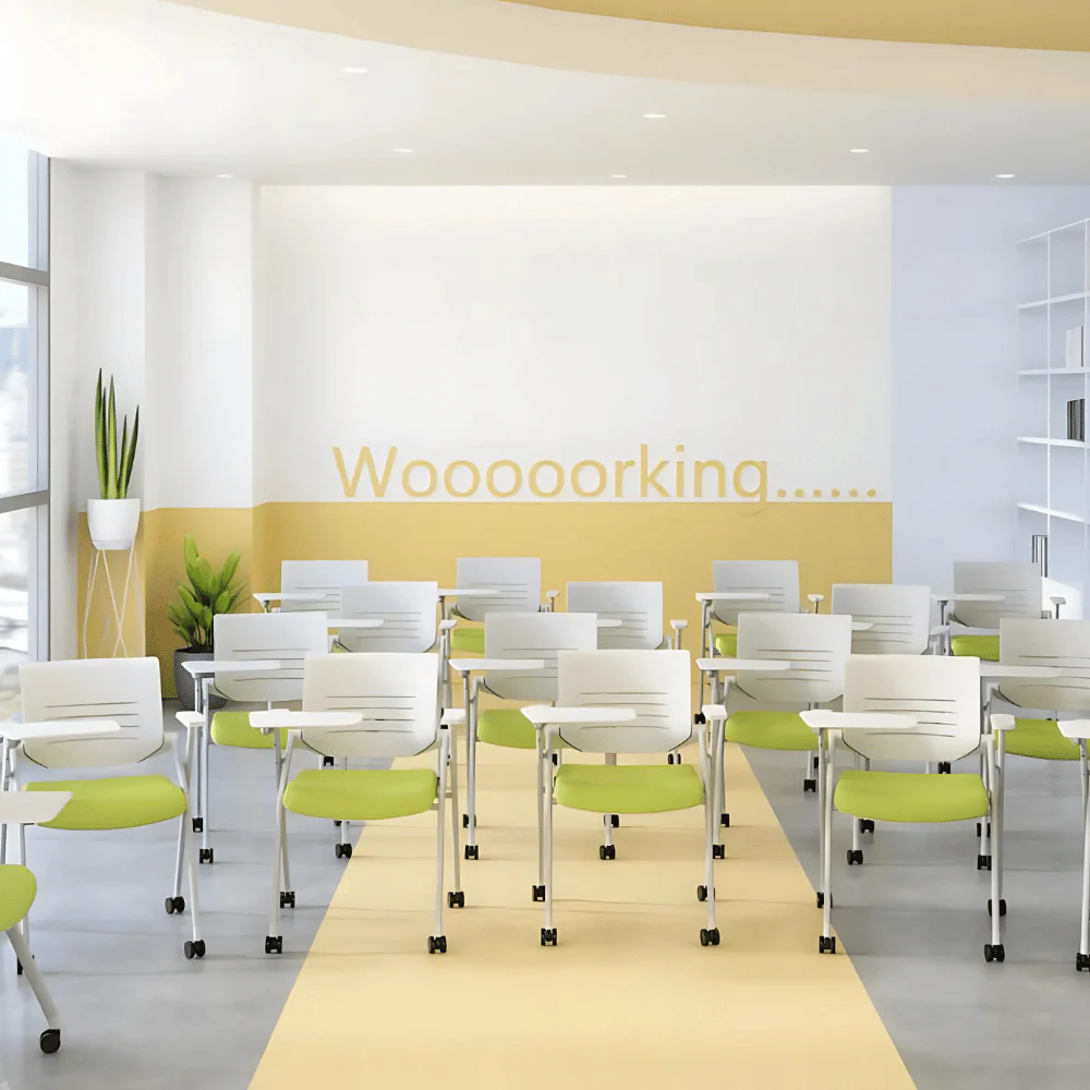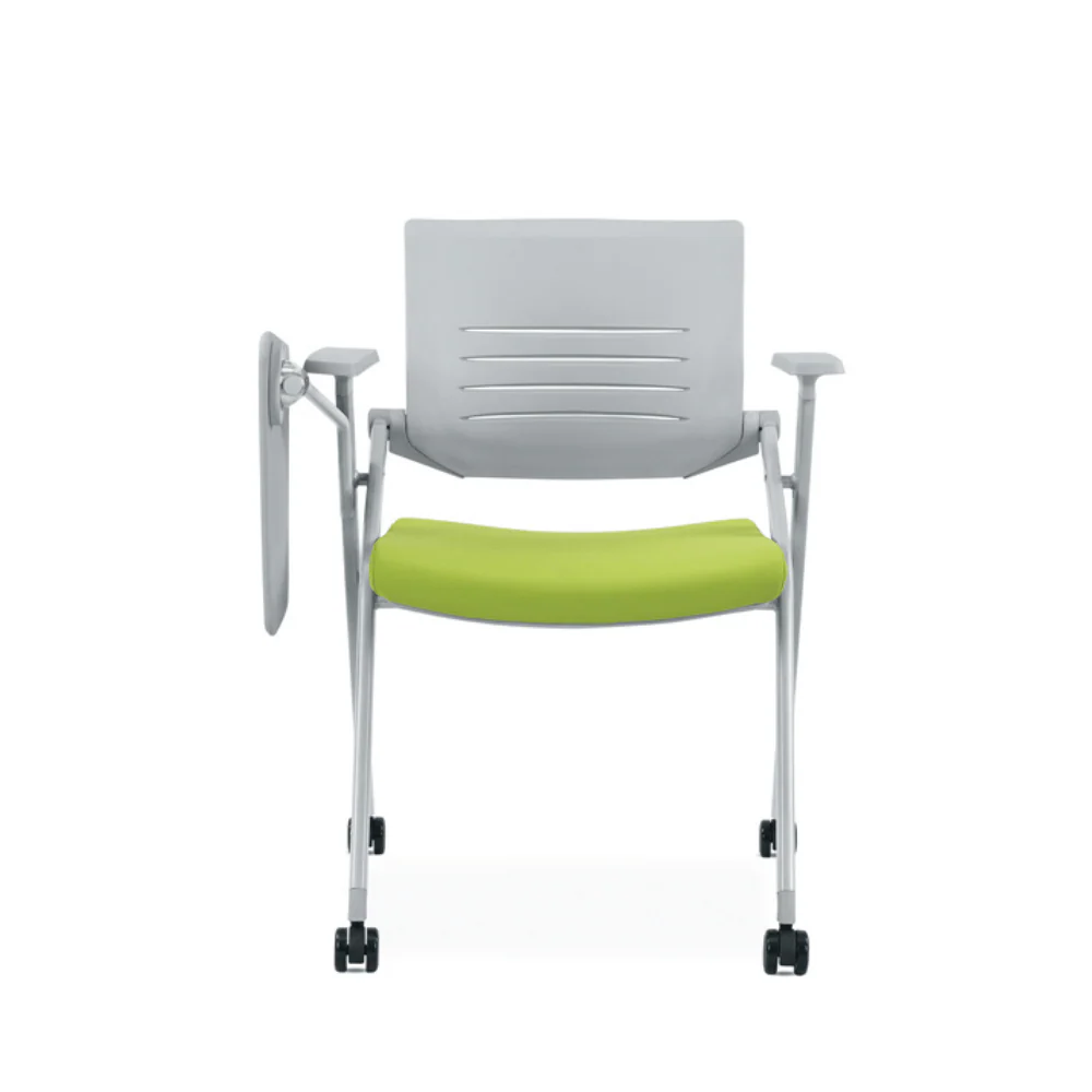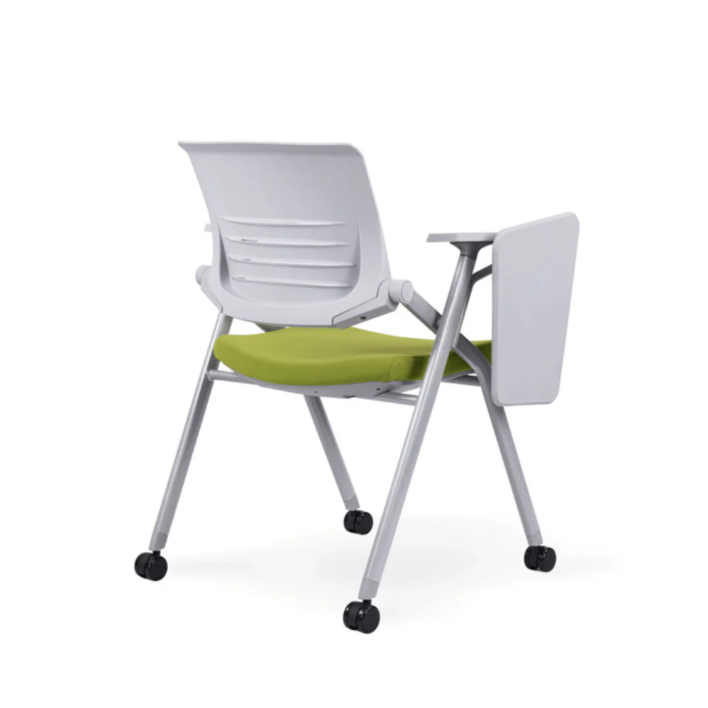 Energia-T 訓練椅配備舒適棉質坐墊與實用寫字板,可選配固定腳墊或滑輪底座。銀色鋁製背部連接器支援自由傾斜功能,有效緩解久坐壓力。創新開槽椅背設計增強透氣性,提升使用時的專注力。具備堆疊收納與可摺疊特性,大幅提高空間利用率,結合寫字板實用功能,完美適用於各類培訓與學習環境。