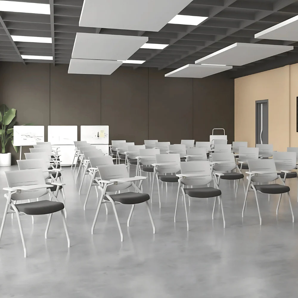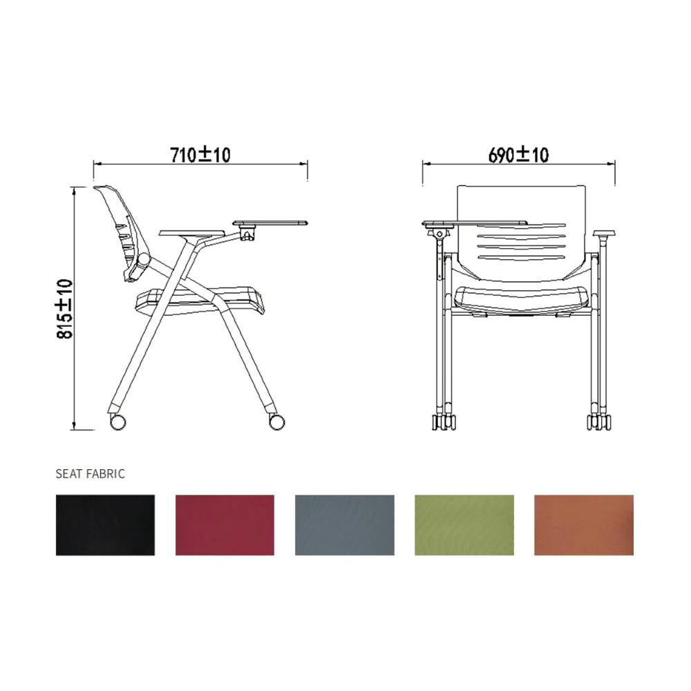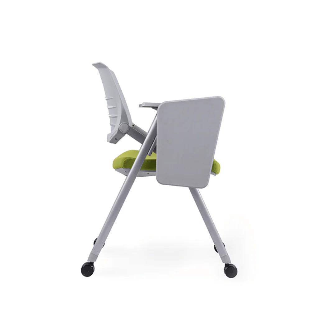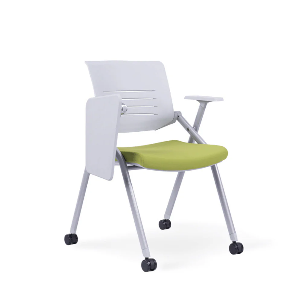 Energia-T 訓練椅配備舒適棉質坐墊與實用寫字板,可選配固定腳墊或滑輪底座。銀色鋁製背部連接器支援自由傾斜功能,有效緩解久坐壓力。創新開槽椅背設計增強透氣性,提升使用時的專注力。具備堆疊收納與可摺疊特性,大幅提高空間利用率,結合寫字板實用功能,完美適用於各類培訓與學習環境。